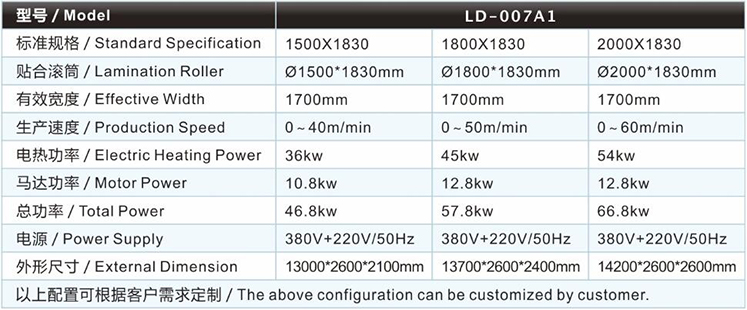 | 潛水料復(fù)合機(jī)/貼合機(jī)-單輪SBR復(fù)合機(jī)/貼合機(jī)LD-007A1的主要技術(shù)參數(shù) / Major technical parameters |