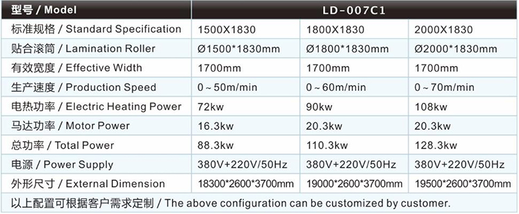 | 潛水料復(fù)合機(jī)/貼合機(jī)-雙輪SBR復(fù)合機(jī)/貼合機(jī)LD-007C1的主要技術(shù)參數(shù) / Major technical parameters |